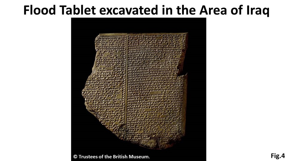 洪水に対する人々の強い想いは,世界でも共通のようです。この写真は,有名な「洪水の粘土板」です(図-4)。これは,1872年にジョージ・スミスによって見いだされ,解読された,現在のイラクにあたる地域で出土した縦6インチ(15.2センチ),横5.25インチ(13.3センチ)ほどの粘土板ですが,その一節にはこうあります。「家を壊して船を作れ。富を捨てて生き延びよ。財産は捨てて,命を助けよ。あらゆる生き物の種をもって船に乗り込め。これから作る舟は,すべての辺が均等になるようにせよ。長さも幅も同じにするのだ。下に海が広がるように,船の上を屋根で覆え。そのあと,大量の雨がもたらされるであろう。」4 このように「洪水の粘土板」は,聖書にあるノアの大洪水と極めて類似した物語が,聖書のはるか昔,紀元前7世紀のメソポタミアで既に記録されていたことを示しています。