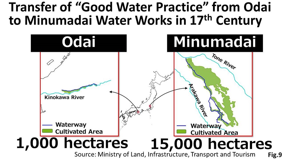 田地域を経て33kmにおよぶ,小田井と呼ばれる新たな用水路を築き,約1,000haの水田を潤すことが可能となりました。この大工事が,中央政府の目に留まることになります。私は,2009年に利根川中流域を訪れ,工事を指揮した紀州藩の井沢弥惣兵衛が,将軍徳川吉宗の命により江戸に赴き,見沼代用水の建設を指揮したことを知りました。井沢は,機械を使った測量やサイフォンなど,小田井の技術と経験を用い,利根川から取水して幹線延長約60kmに及ぶ用水路を建設し,小田井の15倍にあたる約15,000haの水田を潤しました(図-9)。さらに,この経験・技術は首都圏一円に広まり,江戸時代の農業経済の発展を支えることになっていきます。
