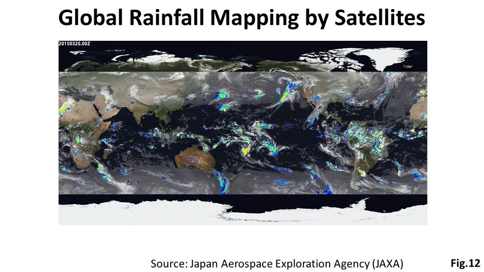 これら水,大気,大地,海流などの膨大な情報はデータ統合解析システム(DIAS)を通じ,防災をはじめとして環境,気候,農業など様々な分野に世界各地で活用されています(図-13-1,13-2)。例えば,ヒマラヤ周辺の大気温上昇が,東アジアの気象擾乱をもたらすメカニズムなど,地球や地域規模での気候変動の解明にもつながってきています。また,開発途上国で,十分に地上で雨量などの観測ができなかった地域でも衛星から雨量を観測し,地域の人たちに洪水警報を伝えることも可能になってきます(図-14)。