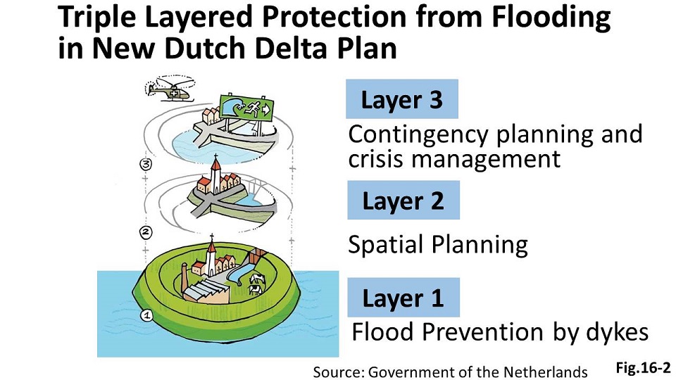 次には,災害に対し強靭な社会を構築することです。例えば,国土の26%が水面下にあるオランダでは,気候変動を踏まえて今後起こりうる水災害に対処するための国家計画である新デルタプランを策定し,百年の大計に基づいた水災害対策に着手したと伺っています(図-16-1,16-2)。この計画では,気候変動によりオランダ沿岸の海水面が2100年までに約0.65メートルから1.3メートル上昇すると試算し,これまで1万年に1回起こる洪水に対処できるようにしてきた計画を,10万年に1回起きる洪水に対しても市民が安全であるように堤防の強化などを行っていく計画に改定したと伺っています。