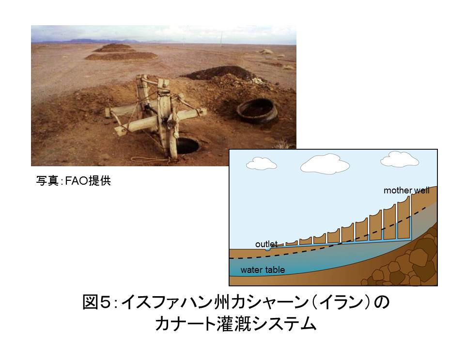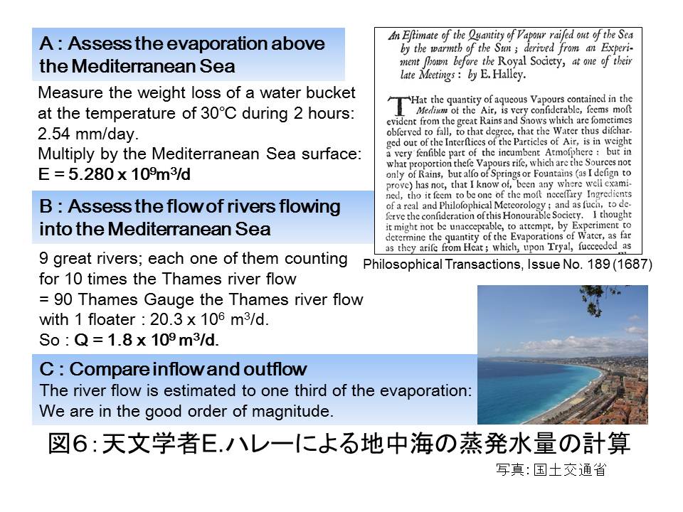 水と科学技術の関係についての一例として水循環についてお話ししますと,古くは紀元前4世紀に哲学者アリストテレスが,大地と海洋の摂理を探求する中,その著書「気象学」において水循環の概念化に取り組んでいます。また,蒸発散の多いイランでは,貴重な水を効率よく採取して運ぶために,紀元前8世紀ごろから「カナート」(図5)とよばれる地下水の利用水路が建設されました。私が1994年に訪問した中東のオマーンでも,「ファラジ」と呼ばれる地下水路を利用した灌漑水路が古くから活用されてきています。さらに17世紀にハレー彗星で有名な天文学者E.ハレー(図6)が,地中海で蒸発する水の量を計算し,そこに流れ込む水の総量より大きいことを示しました。このように自然や時代,社会の要請により,水に関する科学や技術が様々な学術分野に関わって発展してきたことが分かります。