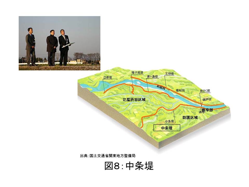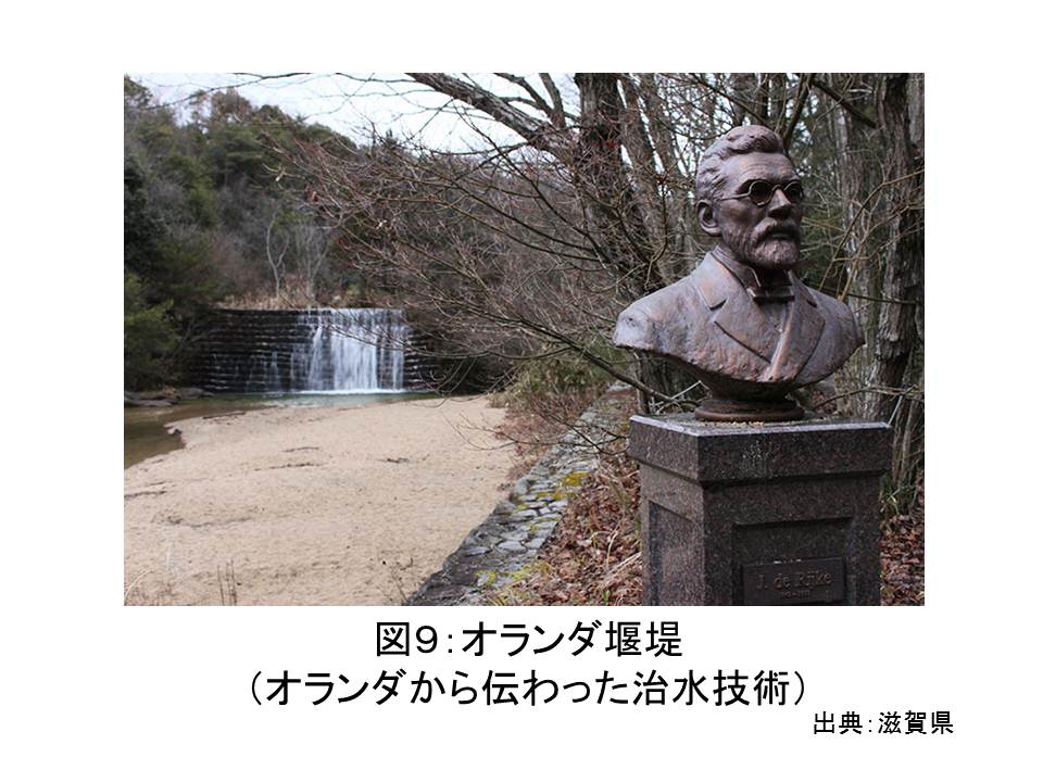 水と災害の分野においてもこのことは同様です。日本では,弥生時代の環濠遺跡(図7)で当時治水・排水に用いられたと考えられる水路が発掘されています。紀元前後の時代に既に洪水を制御するための技術が発達していたわけです。また,私が訪れた利根川では江戸時代にさかのぼり,川から少し離れた場所に中条堤(図8)という堤防が建設され,江戸(今の東京)への洪水の侵入を防ぐ工夫がなされていました。さらに近代になるとオランダなどの進んだ治水利水技術(図9)が取り入れられました。明治時代に洪水防止を目的として,オランダ人技師ヨハニス・デ・レーケの計画に基づいて実施された木曽三川の分流工事は,その一例です。日本でもより良い安全な暮らしへの希求が水防災の技術を発展させてきたと言えます。