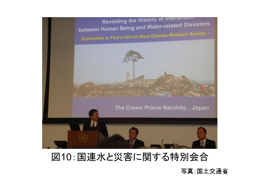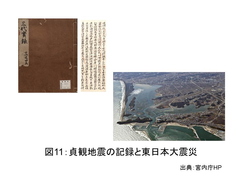 これまで,水と水災害に関する科学技術の発展の歴史をお話ししましたが,過去の水に関する歴史記録が将来の科学技術的知見の発展につながることもあります。私は2013年,バンキムン国連事務総長の主催による水と災害に関する特別会合(図10)で基調講演を行い,水災害に関する日本の文書,記録についてお話ししました。その際に東日本大震災より千年以上前の869年に起こった貞観地震の災害記録(図11)を元に,地質調査の結果と合わせ当時発生した大津波が,東日本大震災で発生した津波に匹敵するものであることに触れました。東日本大震災では史上まれにみる大きな津波による被害がありましたが,日本では過去にこれと同レベルの津波が発生していたことが歴史記録を手掛かりに確かめられたわけです。過去の災害経験は,次なる災害に備えるための最善の教訓を与えてくれます。水と人との関わりについての過去の記録を丁寧にたどっていくことで,水と人とのより良い未来のための科学の発展へとつながっていくこともあるのです。