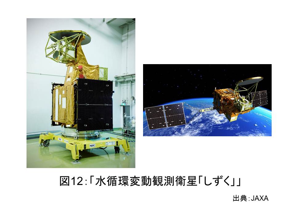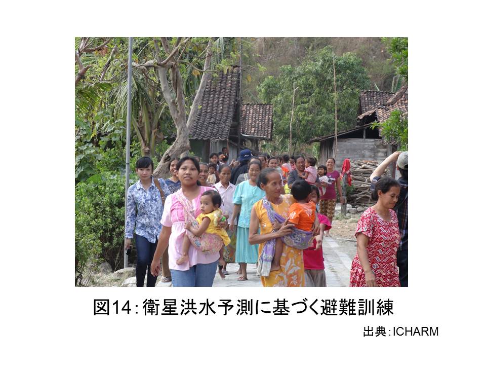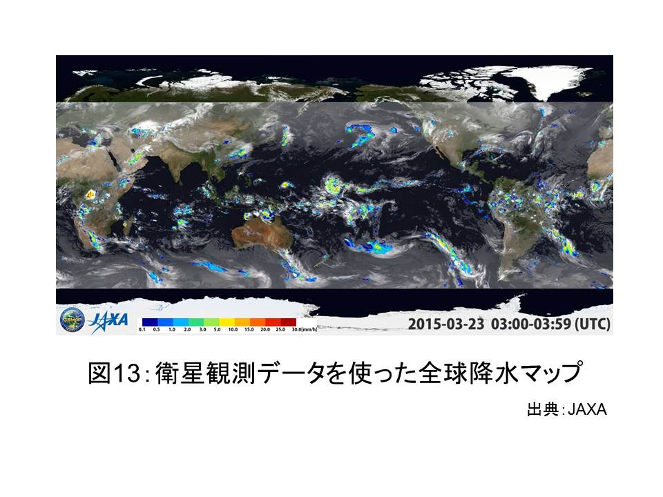 私は2010年9月に,現オランダ国王陛下ウィレム・アレクサンダー公をつくばの宇宙研究開発機構(JAXA)にご案内し,地球上の水の観測に宇宙開発の技術が深く関わっていることを学びました。その際に見学した水循環変動観測衛星「しずく」(図12)は,その後打ち上げられ,現在地球を周回しながら水蒸気や雲,降水の状態を伝えてきています。その「しずく」などが送るデータ(図13)などを元に,世界各地の降雨の状況を伝え,人々に洪水の予測情報を伝えることが可能になってきています。これにより,それまで洪水の到来を予測する術のなかった発展途上国や遠隔地でも人々が洪水に備え,避難などの行動を起こすことも可能になってきました(図14)。恵まれない地域でも洪水から人々を守りたいという想いが,科学に携わる人々に伝わり,宇宙技術という現代の技術の粋を通じて実現した一つの例と言えます。