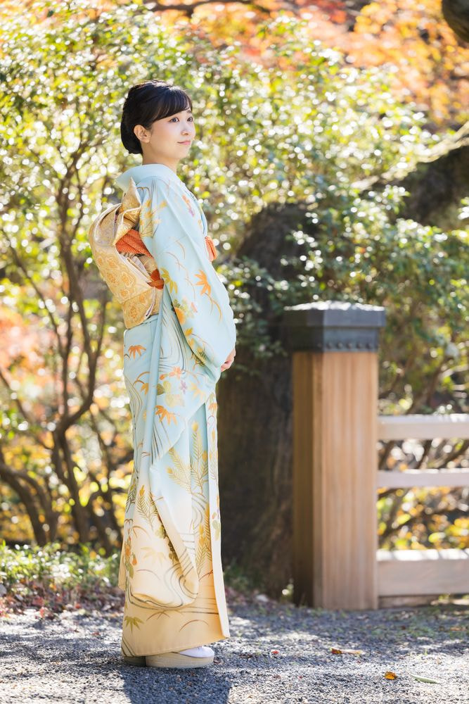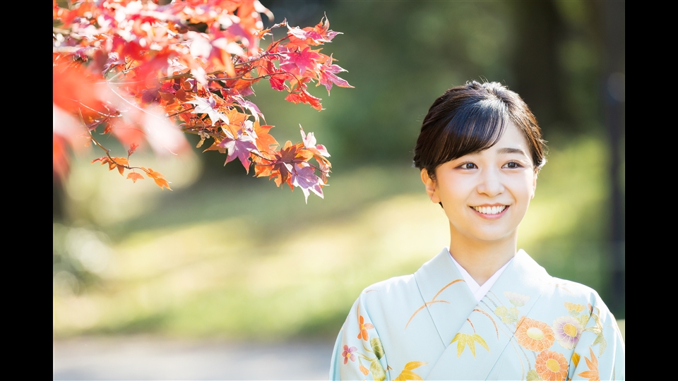 本年のお誕生日にむけた撮影では、お振袖をお召しになりました。お振袖は、浅葱色(青系統の伝統色)とクリーム色のぼかし染めに、流水や松、菊などの文様が描かれています。帯は金地の七宝華紋柄(円が連なった文様と花の文様の組合せ)で、帯締めと帯揚げは茜色(赤系統の伝統色)です。撮影は、12月初旬に赤坂御用地内で行われました。気温は低かったものの、とてもよいお天気で、広がる青空を背景に、木々が黄色や赤色に色づき始めていました。