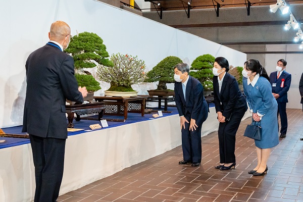 盆栽の種類、 作品の見どころ、樹木の品種について、関係者からの説明を関心深くお聞きになり、盆栽の手入れの方法、開花時期の調整、国風賞作品の審査のポイント等についてご質問になりました。