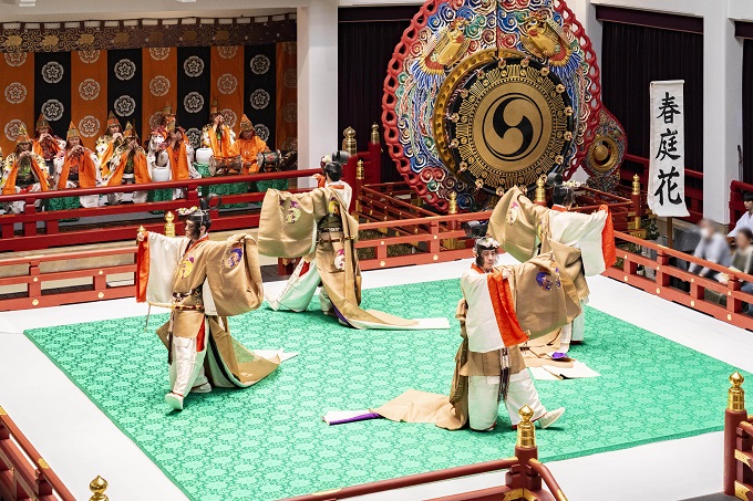 | 「春庭花」の一場面(舞楽曲が流れます) 舞いながら舞台を回る姿は、あたかも花が開いたり、閉じたりする様を思わせる優麗な舞です。 |