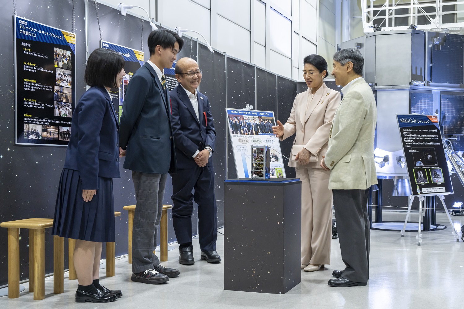 天皇皇后両陛下は、岐阜かかみがはら航空宇宙博物館において、第39回国民文化祭「空宙博特別企画展 月への挑戦-アポロ計画から50年、人類は再び月を目指す-」をご覧になりました。両陛下は、「ぎふハイスクールサットプロジェクト」の展示をご覧になった際に、プロジェクト参加者である大学教授と高校生から説明をお受けになりました。両陛下は、プロジェクトへの参加人数や、人工衛星の性能等についてご質問になりながら、プロジェクトの詳細や今後のスケジュールについての説明を関心深くお聞きになりました。