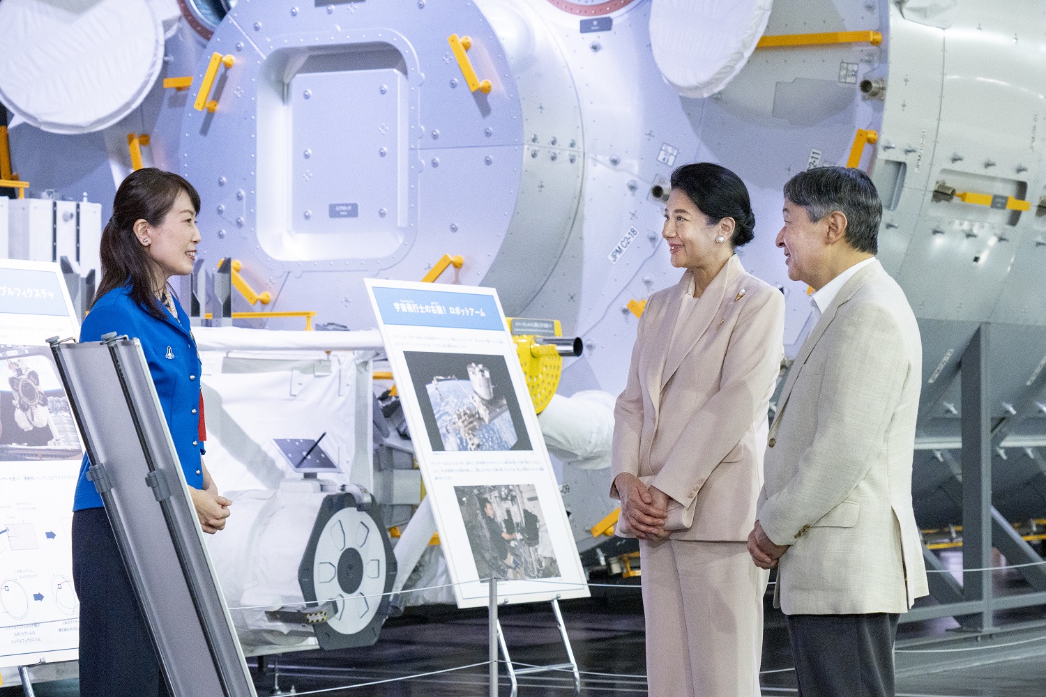 その後、両陛下は、国際宇宙ステーション(ISS)日本実験棟「きぼう」模型をご覧になりました。両陛下は、同博物館のアンバサダーである宇宙飛行士の山崎直子さんから、「きぼう」を始めとするISSのシステムやISS滞在中の活動内容についての説明をお受けになりました。両陛下は、宇宙飛行士時代の経験談を含め、山崎直子さんの説明を関心深くお聞きになりました。