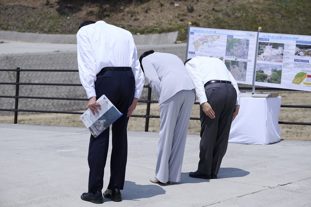 平成26年8月20日の豪雨により土石流が発生し、住宅8棟が全壊し23名が亡くなった地区に整備された砂防堰堤の前で、両陛下は、土砂災害時の状況、復興への取組等について、説明パネルのほか、岩石や土の実物をご覧になりながら説明をお受けになりました。