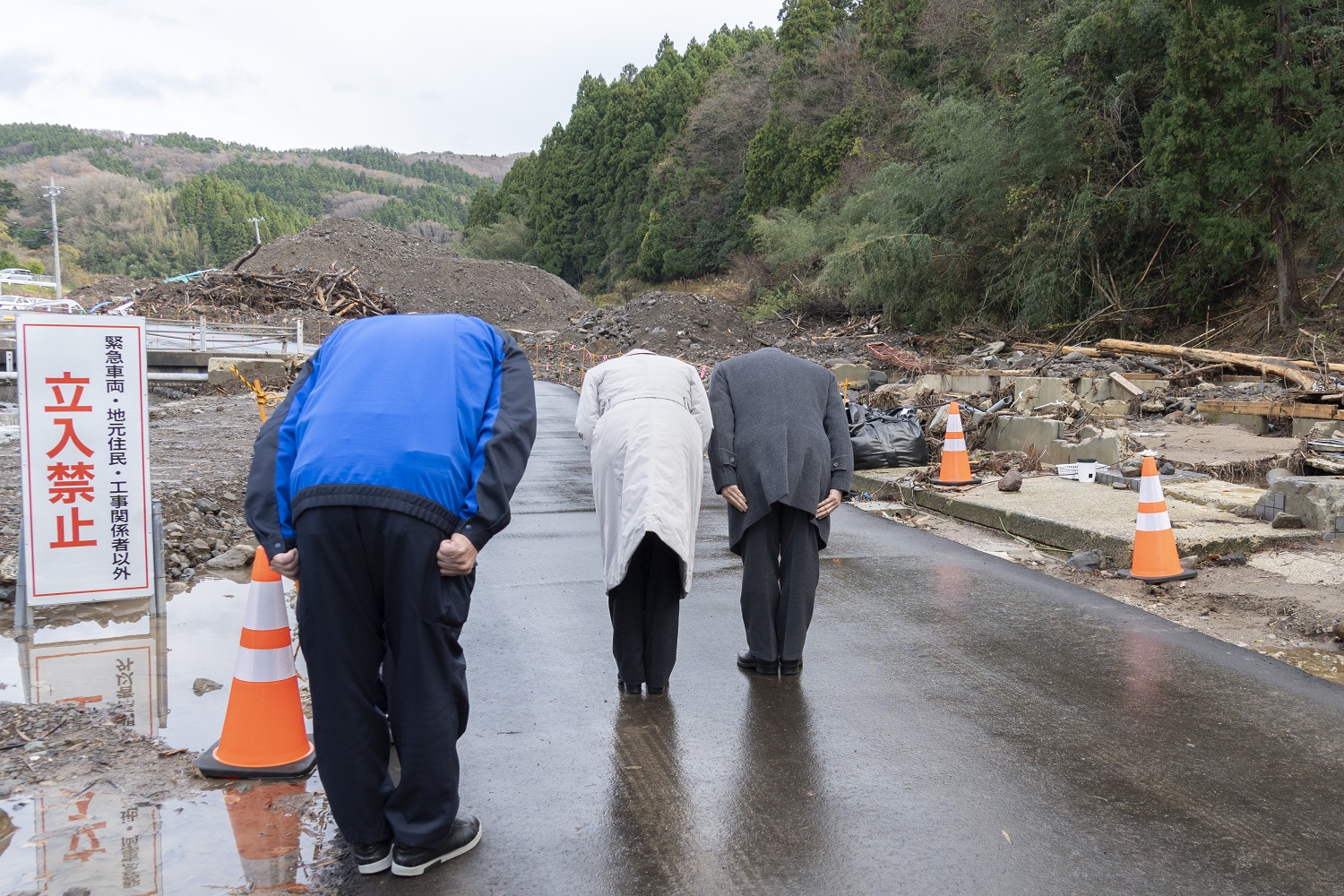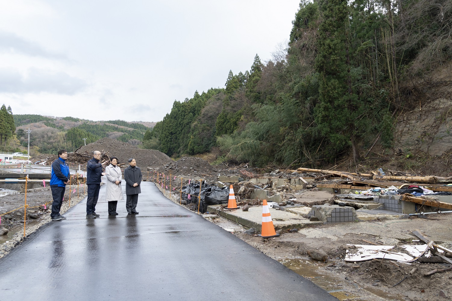 両陛下は、被災地の状況をご視察になりました。大量の流木や土砂によって家屋が流失した現場をご覧になり、被害の凄まじさや土砂災害の怖さを実感されました。