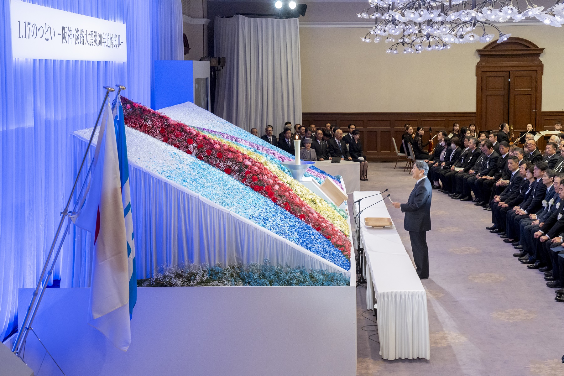 続いて、両陛下は「1.17のつどい-阪神・淡路大震災30年追悼式典-」にご臨席になりました。この式典では、天皇陛下がおことばをお述べになり、その後、両陛下でご供花になりました。両陛下は、震災により亡くなった多くの方々に哀悼の意を捧げられました。