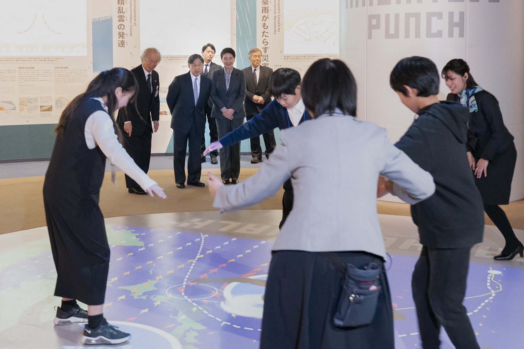 両陛下は、地元の小学生による体験展示の体験状況をご覧になり、子どもたちが楽しく防災について学べるよう工夫された展示に感心されました。また、その後、小学生と和やかにご交流になりました。
