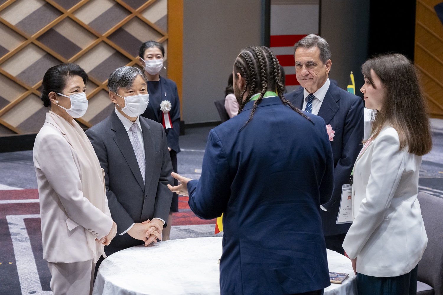ご視察終了後、両陛下は、関係者とご懇談になり、今回日本に招へいされて滞在中の外国青年が、地方プログラム(愛知・沖縄)に参加した際の印象や、日本青年が、今回の会議直前に参加した派遣国活動(モロッコ・ドミニカ共和国)の感想などについてご質問になりながら、青年たちの話を関心深くお聞きになり、和やかにご歓談になりました。