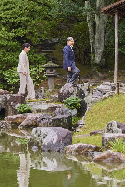 両陛下は、書院や建物群の説明をお受けになりながら、雨上がりの庭園をご散策になり、各所に工夫の凝らされた歴史ある桂離宮の風情をお楽しみになりました。