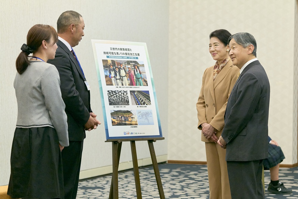 次に両陛下は、漁業関係者とご懇談になりました。水産物の生産、資源管理、海の環境保全活動等の取組により、豊かな海づくりに貢献されている方々からお話をお聞きになり、それぞれの取組が実を結んでいくことを願われました。