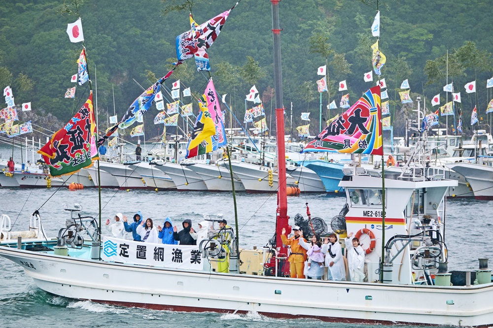 海上歓迎行事では、歓迎船による漁船披露及び漁船による三重県を代表する漁法等を紹介するパレードをご覧になり、お手を振ってお応えになりました。