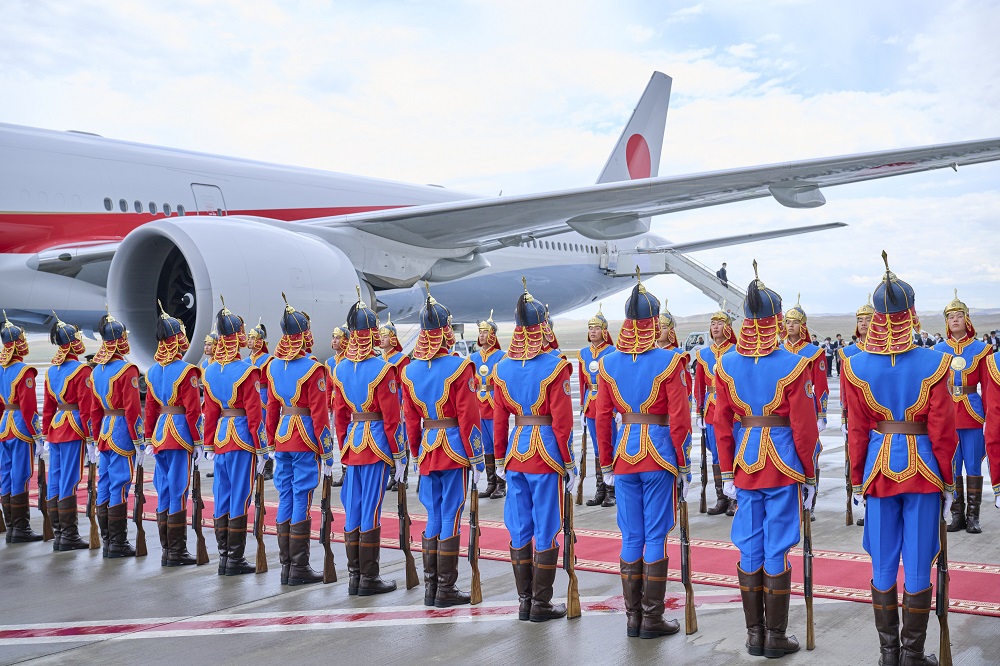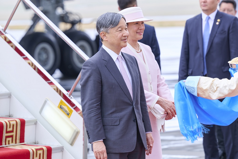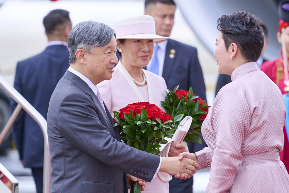 6日午後、天皇皇后両陛下は、チンギス・ハーン国際空港にご到着になり、バトツェツェグ外務大臣、バヤルサイハン駐日モンゴル大使、井川原駐モンゴル日本国特命全権大使夫妻などの挨拶をお受けになった後、ご宿舎にご移動になりました。両陛下は、銀杯に盛られたモンゴルの伝統的な乳製品のアーロール、花束を始めとするモンゴル側のおもてなしをにこやかに受けられました。