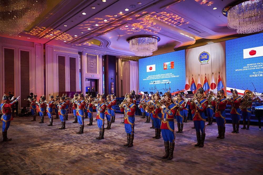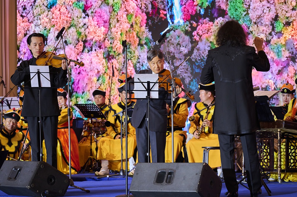 天皇陛下は、晩餐会にて、モンゴルを代表するアーティストの方々の質の高いパフォーマンスをご覧になるとともに、国立馬頭琴交響楽団とご共演の形でビオラをご演奏にもなり、充実された時間を過ごされました。皇后陛下は、晩餐会の中のパフォーマンスを通じて、モンゴルの人たちの豊かな芸術性をお感じになり、才能が豊かであることに感銘を受けられました。