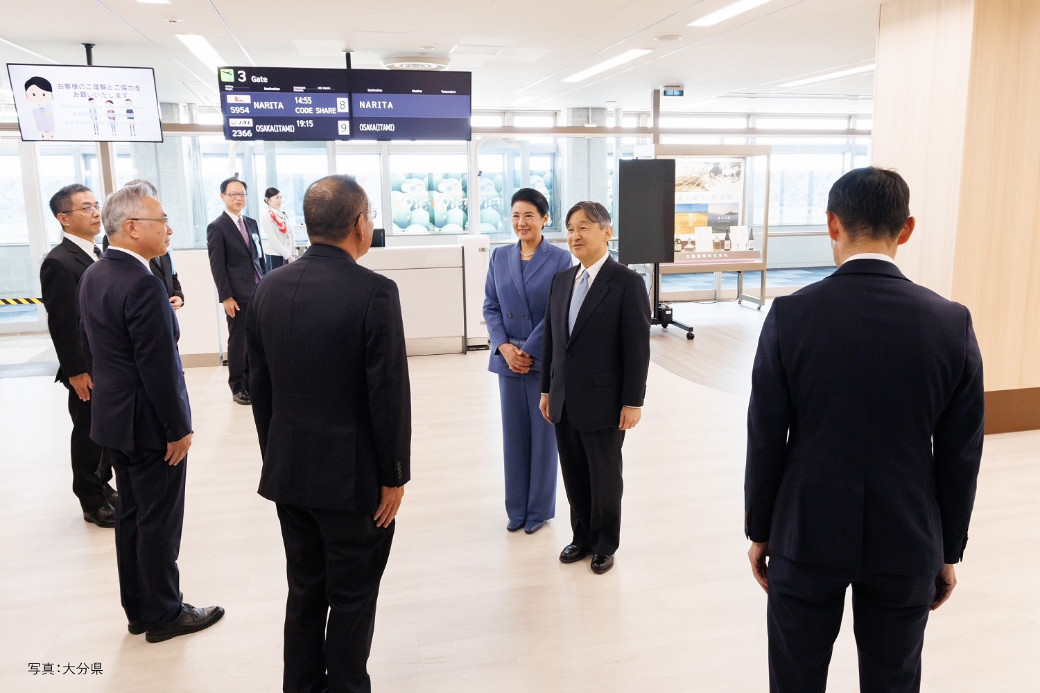 | 大分空港で出迎えを受けられる天皇皇后両陛下 (写真:大分県) |