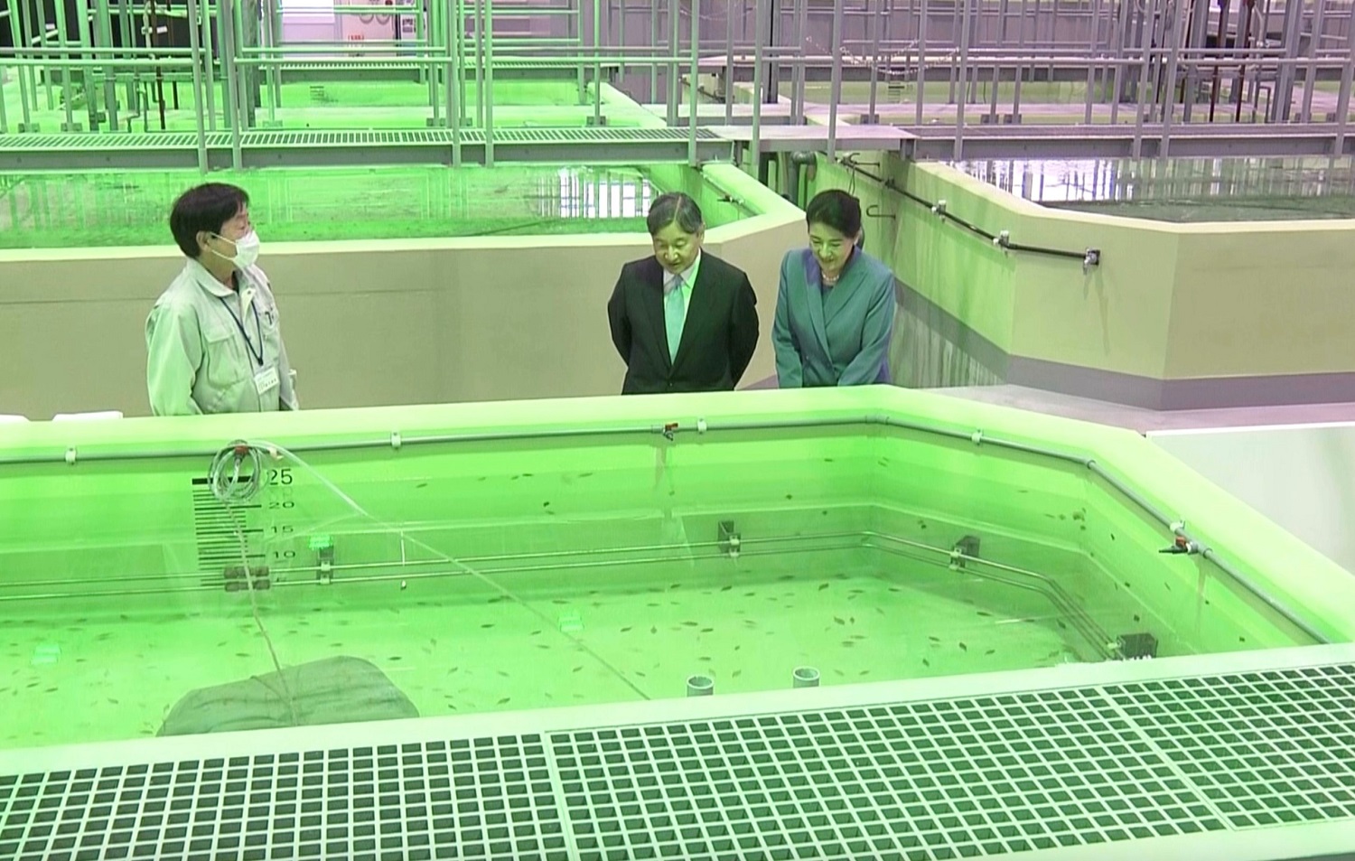 | 緑色LED光照射飼育(※)水槽についての説明をお聞きになる天皇皇后両陛下 |
