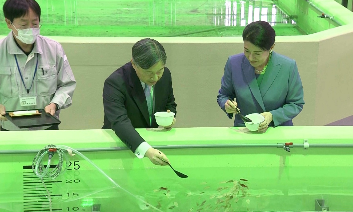 | マコガレイの稚魚への給餌をご体験になる天皇皇后両陛下 |