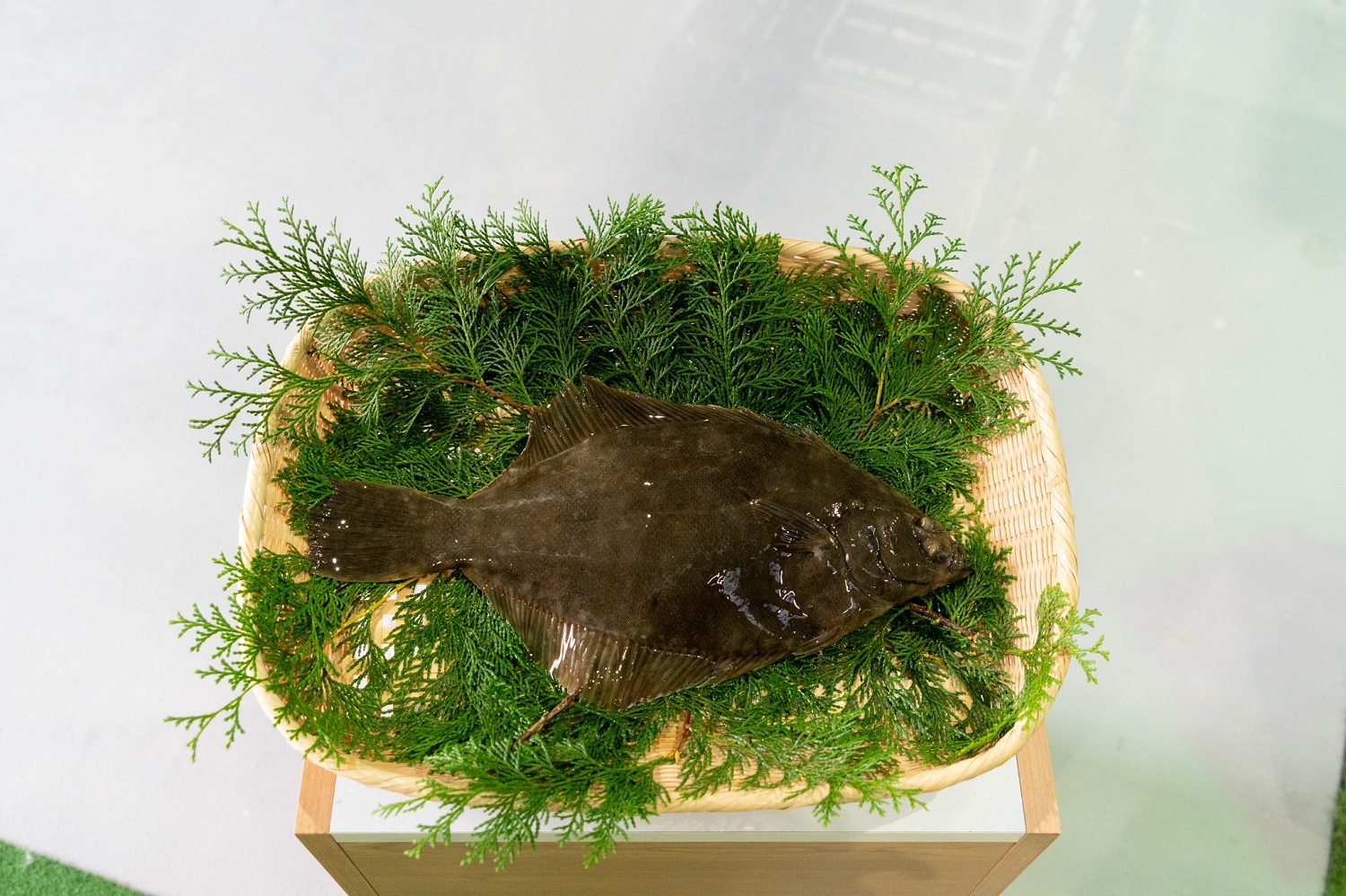 | 「つくり育てる漁業」の取組及び漁法についての説明をお聞きになり、別府湾で獲れたマコガレイ(城下かれい)をご覧になる天皇皇后両陛下 |