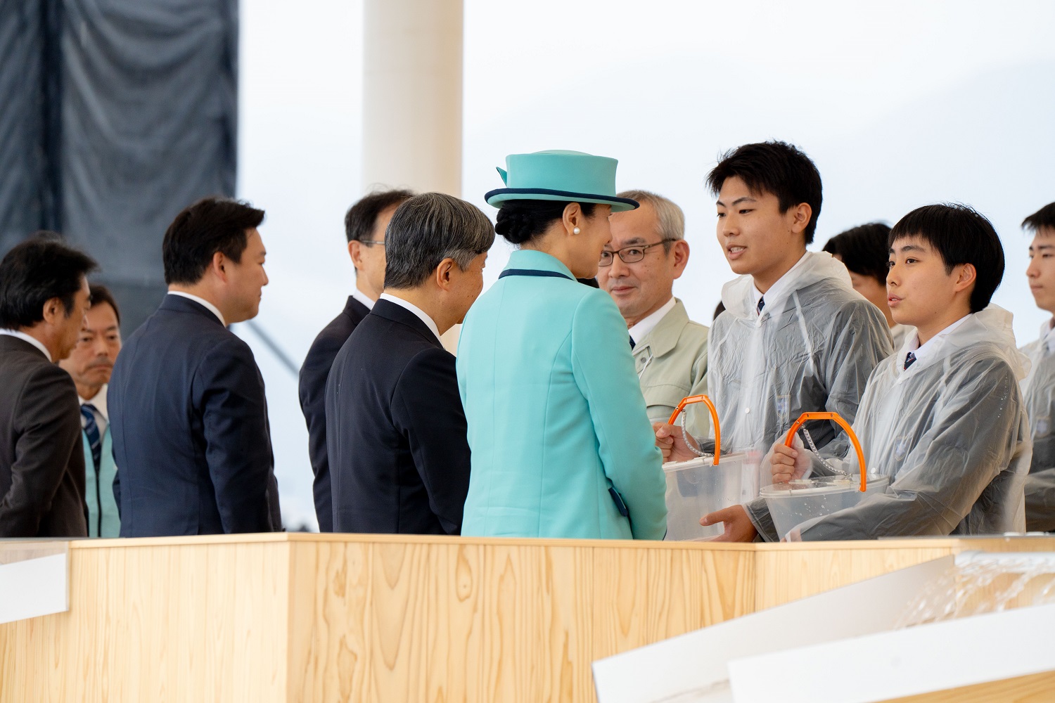 両陛下は、関係者の皆さん、中でも雨の中、レインコートを着て放流の介添えや合図をしてくれた高校生や小学生の皆さんにおねぎらいのお気持ちをお持ちになりました。