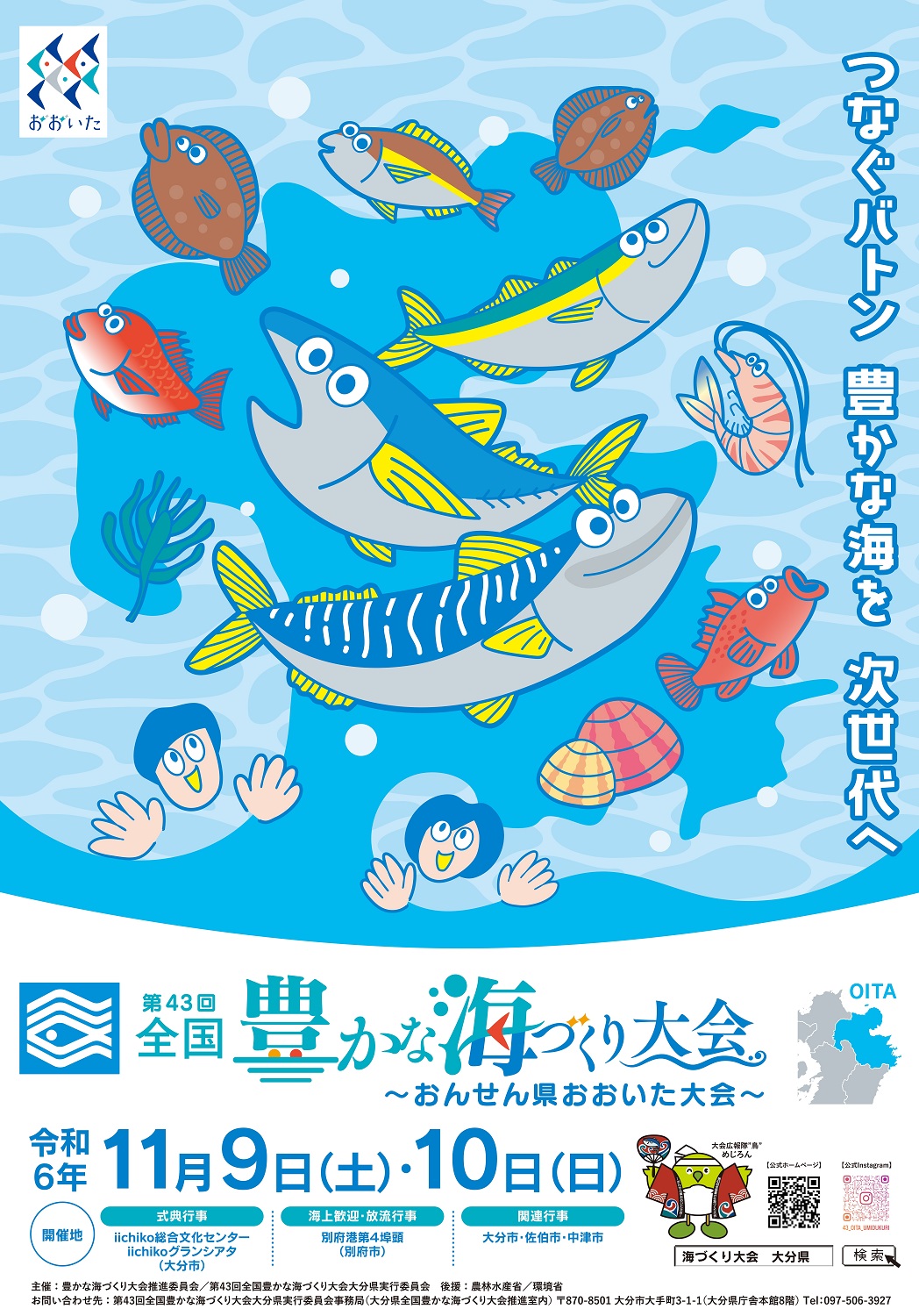 【全国豊かな海づくり大会】 全国豊かな海づくり大会は、水産資源の保護・管理と海や河川・湖沼の環境保全の大切さを広く国民に訴えるとともに、つくり育てる漁業の推進を通じて、明日の我が国漁業の振興と発展を図ることを目的として、昭和56年に大分県において第1回大会が開催されて以降、令和2年の新型コロナウイルス感染症の感染拡大の影響による延期を除き、毎年開催されています。 昭和56年大分県鶴見町(現:佐伯市鶴見)で開催された第1回全国豊かな海づくり大会は、当時の皇太子同妃両殿下(現在の上皇上皇后両陛下)がご臨席になっており、今回は43年ぶり、2回目の開催となりました。 |