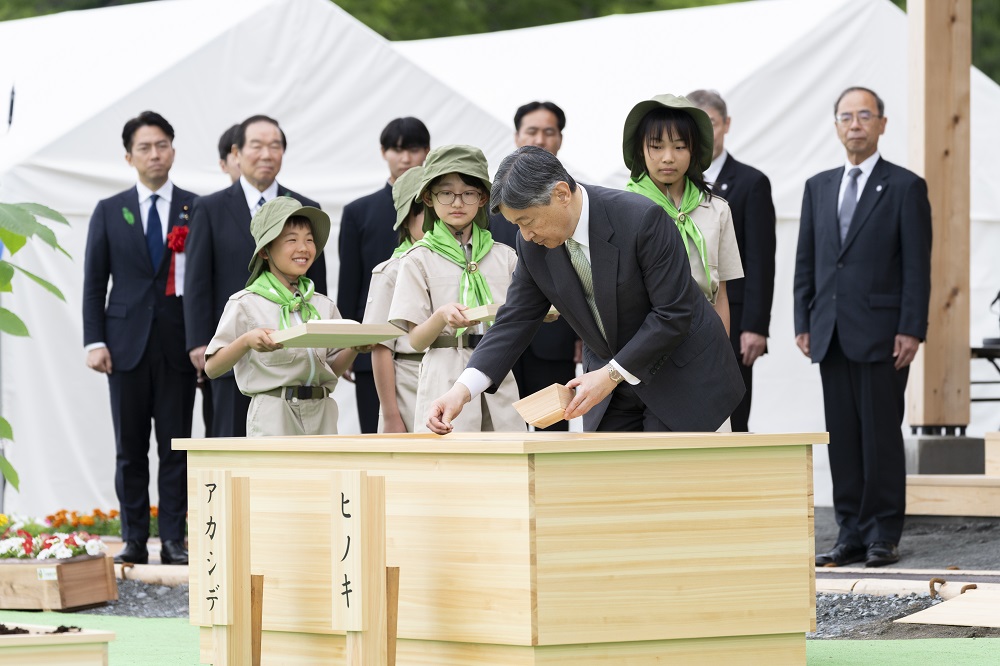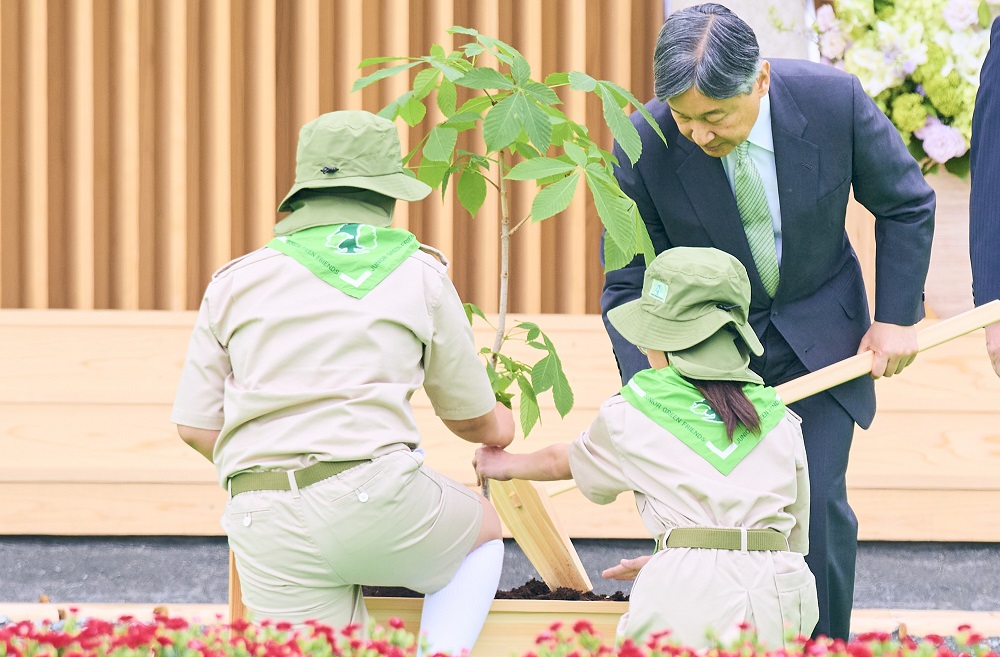 天皇陛下は、緑の少年団の介添えをお受けになり、ケヤキ、スギ(少花粉)、トチノキの苗木をお手植えになりました。