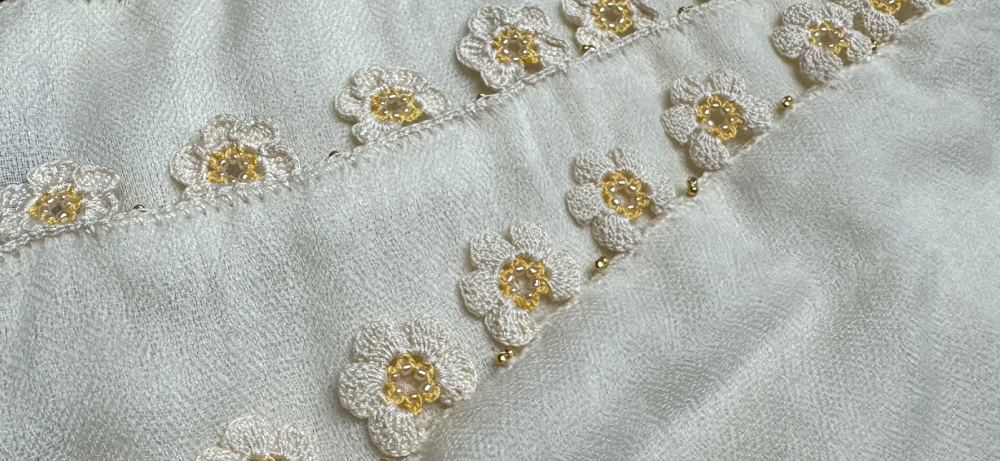 トルコ訪問前に刺繍糸を手編みしたカモミールの花
